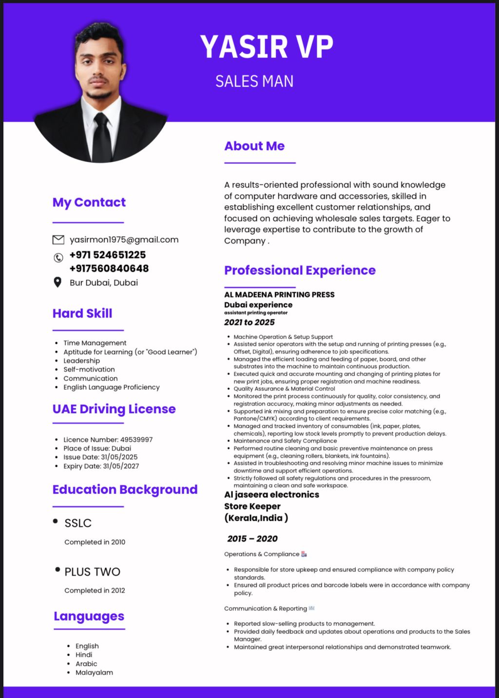 Yasir from India, having 2 years of experience in printing press in UAE, I have valid driving license. I am looking for a new job in Dubai. I am available to join immediately