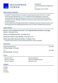 I am Muhammed Usman, currently in Dubai on a visit visa, with one month remaining. I have Plus Two qualification and Optical Fiber Technician course completed, plus some sales experience. I can handle Malayalam and English fluently, have basic knowledge of Hindi, and can read Arabic. Looking for a suitable job now