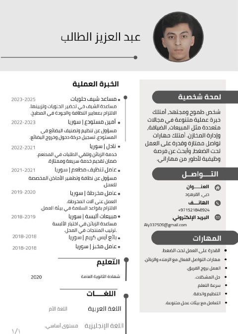 أنا خالد أنور من مصر، أتمتع بخبرة أكثر من 10 سنوات في مجال الضيافة والمطاعم. أتميز بالسلوك الراقي، والمظهر اللائق، والابتسامة الدائمة، مع قدرة عالية على تقديم خدمة ممتازة للضيوف والعمل بروح الفريق والحفاظ على أعلى معايير النظافة والانضباط