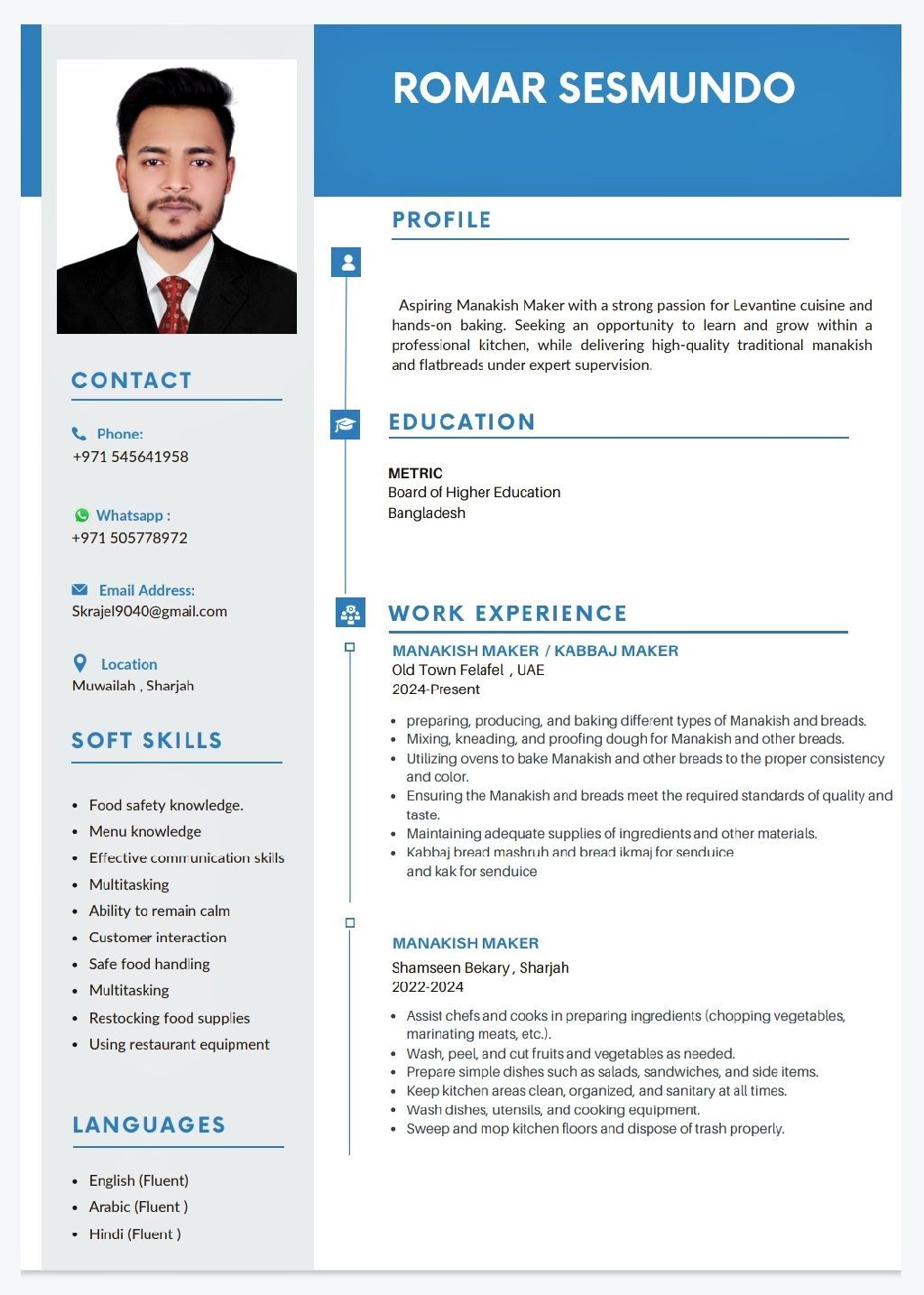 MANAKISH MAKER/ KABBAJ MAKER Old Town Felafel, UAE 2024 - Present SOFT SKILLS preparing, producing, and baking different types of Manakish and breads Mixing kneading and proofing dough for Manakish and other breads. Utilizing ovens to bake Manakish and other breads to the proper consistency and color, Ensuring the Manakish and breads meet the required standards of quality and taste Maintaining ade