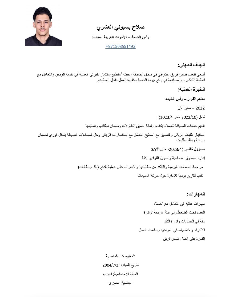 أنا صلاح شاب مصري ابحث عن عمل داخل الدولة عندى خبرة في مجال المطاعم والكافيهات الكاشير والوايتر والتيكاوى وخدمة الزبائن داخل الدولة ثلاث سنوات