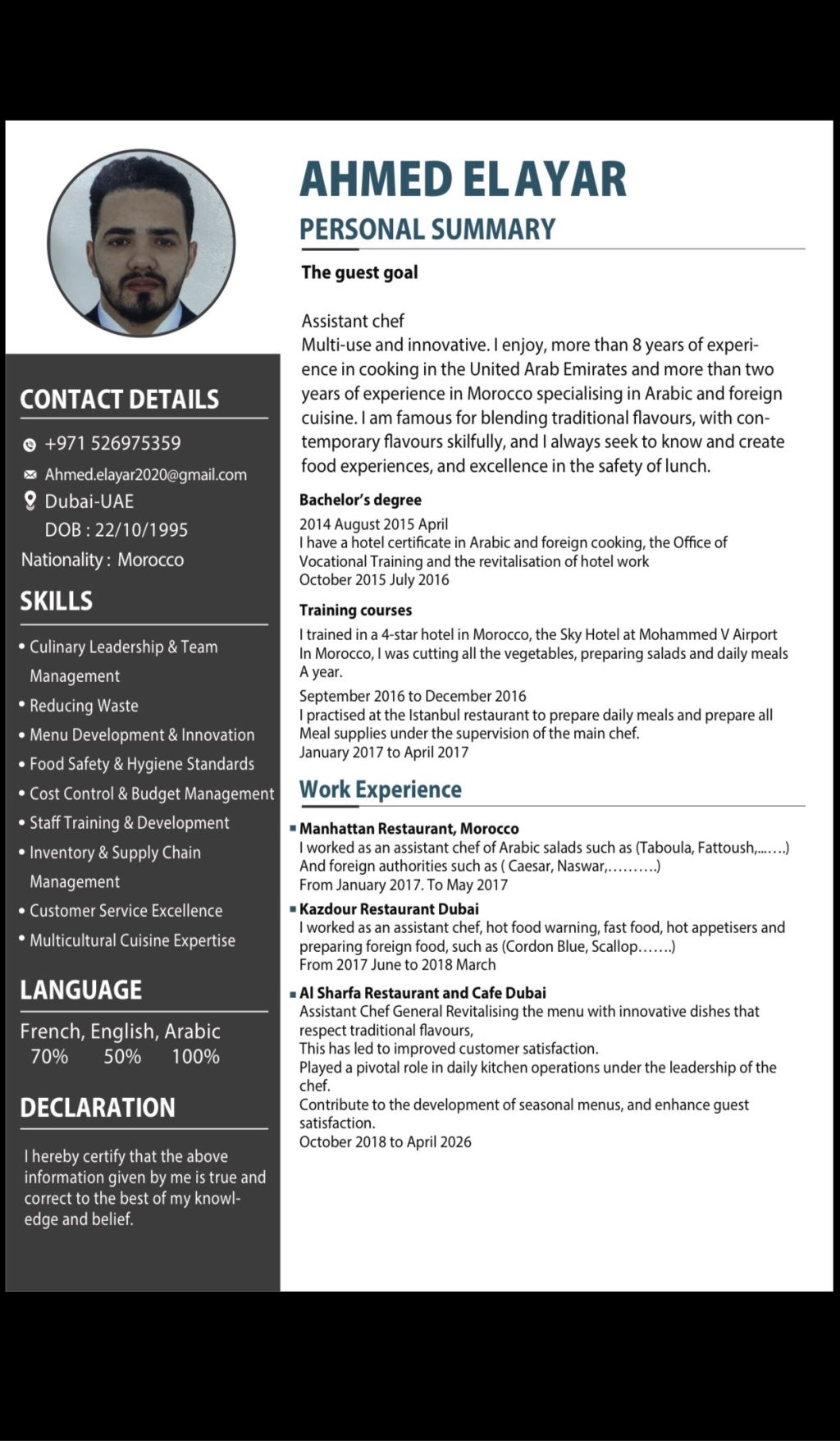 مساعد شيف تحضير وتنفيذ الوصفات بدقة، وضمان أن كل طبق يفي بمعايير الجودة وتوقعات التقديم. إدارة مستويات المخزون من خلال تتبع استخدام المكونات، وتقليل الفاقد، وطلب الإمدادات حسب الحاجة للحفاظ على كفاءة المطبخ