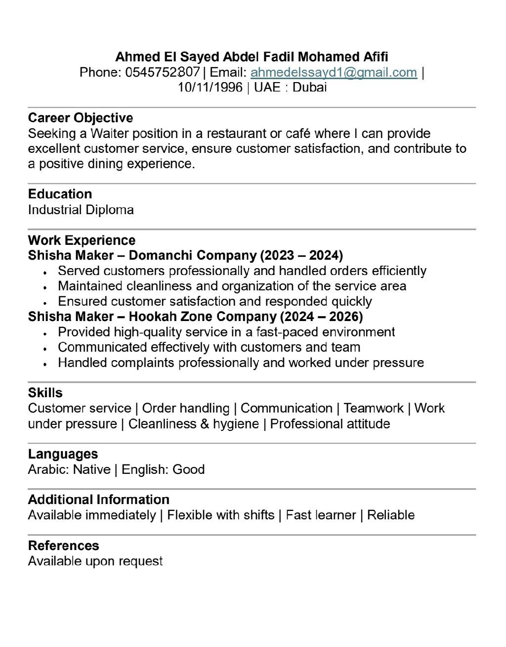 ابحث عن ايجاد فرصة عمل في مجال المطاعم والكافيه ولدي اقامة