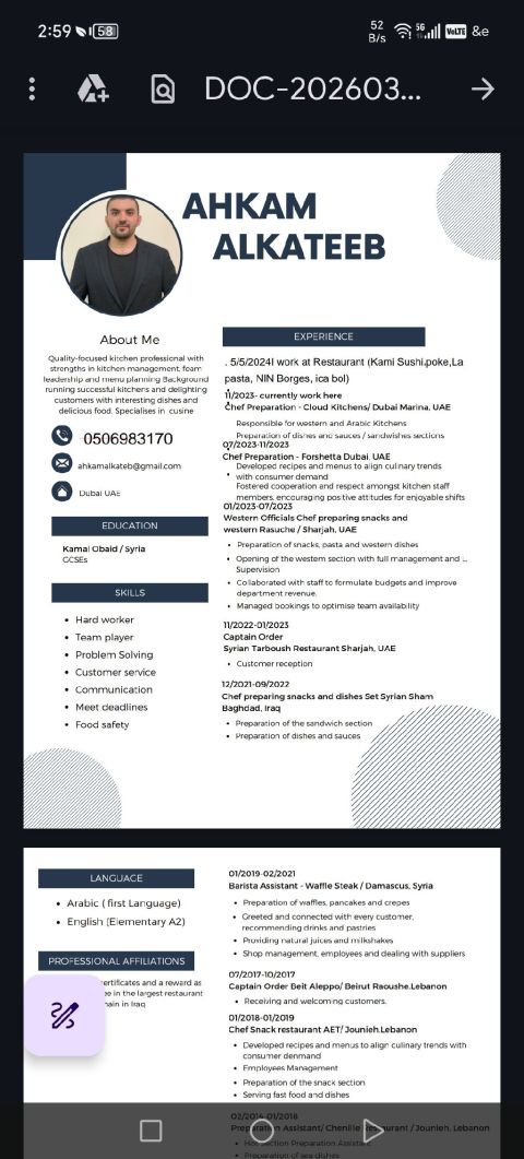 أنا شاب مغربي أتوفر على خبرة تفوق 10 سنوات داخل دولة الامارات في مجال الطبخ، متخصص في اعداد وجبات الفطور، المعكرونة، البرجر، والمأكولات العالمية والوجبات السريعة. ماهر في تحضير الفطور الغربي بجميع أنواعه (البيض، النقانق، الفاصوليا، التوست، البطاطا. مع تقديمه بطريقة احترافية وشهية. أجيد إدارة المطبخ باحترافية عالية، مع خبرة كبيرة في تنظيم العمل وتجديد قائمة الطعام باستمرار، بهدف تحسين الجودة و