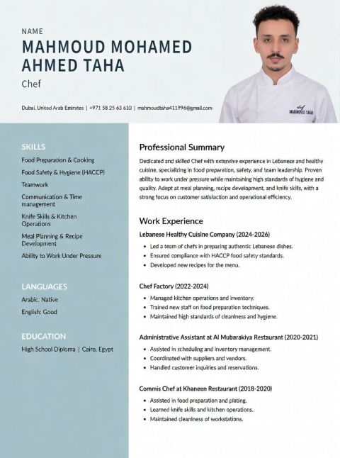 Professional Chef capable of managing and running kitchen operations efficiently, experienced in healthy meals and Lebanese cuisine. Skilled in training and motivating teams for optimal performance