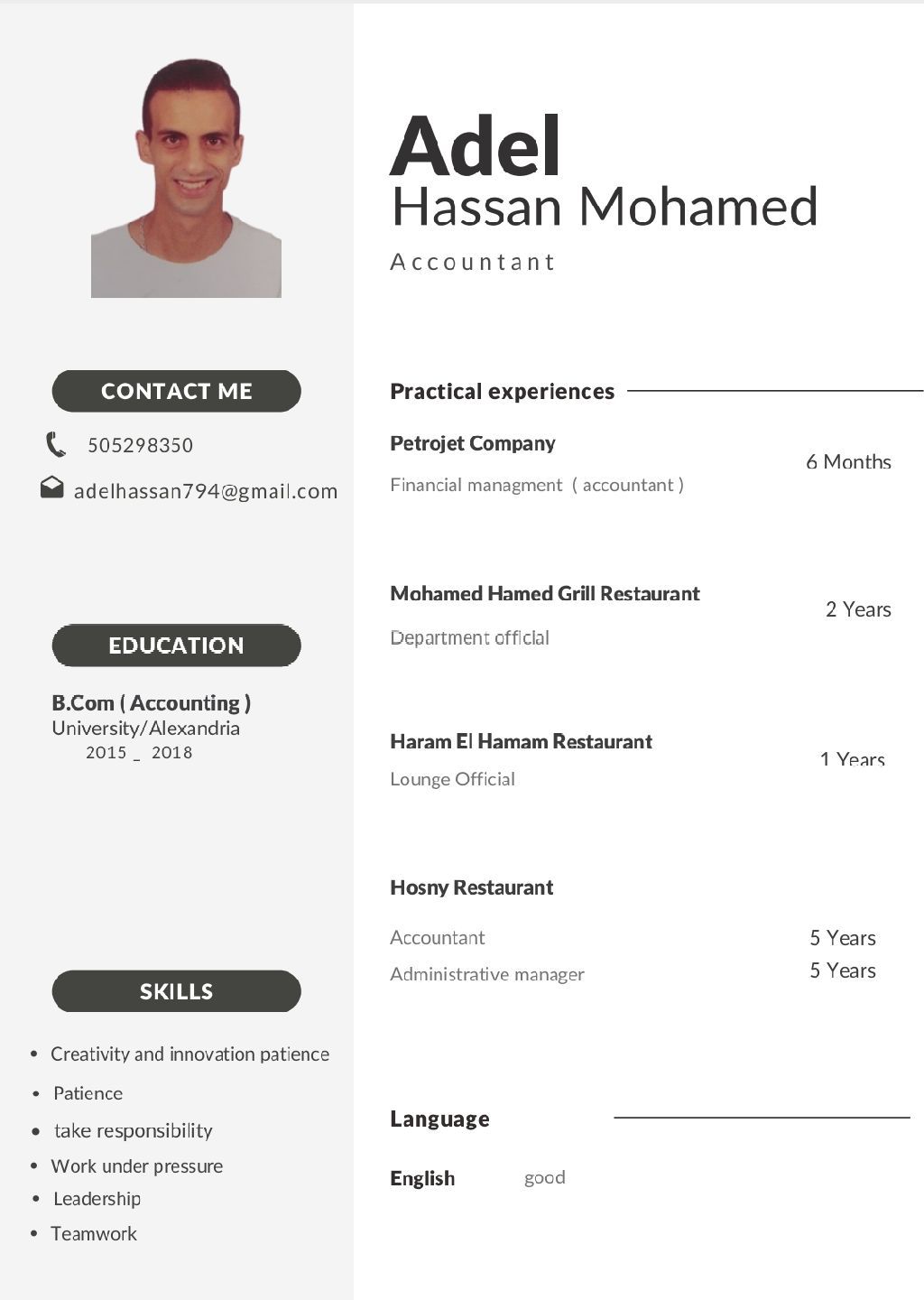 I am looking for a job in the restaurant field. I have 14 years of experience in the restaurant field as a waiter/ order captain/ cashier. I am a graduate of the Faculty of commerce, Alexandria University. I have a valid residence permit in the UAE. I used to work in the most famous fish and grill restaurants in Egypt (Hosny Restaurant/ Haram El Hamam Restaurant/ Qadoura Restaurant/ Mohamed Hamed Resta