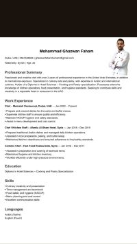 Professional Chef Seeking Employment in Dubai, UAE Experienced chef specializing in Eastern and Western cuisine, including Western and Syrian desserts. Known for cleanliness, precision, and speed in the kitchen, with experience working in restaurants and hotels. Looking for a full time position in a reputable restaurant or hotel in Dubai, 9 hours daily. Contact via WhatsApp only