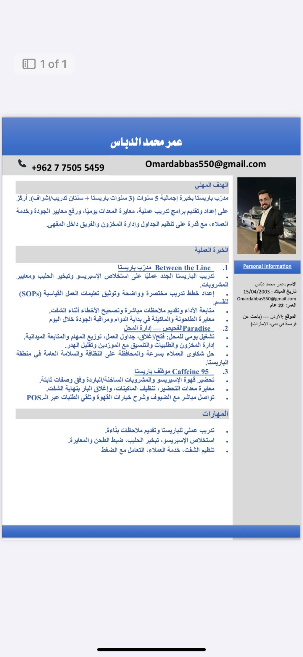 Omar - Experienced barista with 5 years in the coffee field, including 3 years as a barista and 2 years in barista management. Skilled in coffee preparation, customer service, and team supervision. Seeking a new barista opportunity