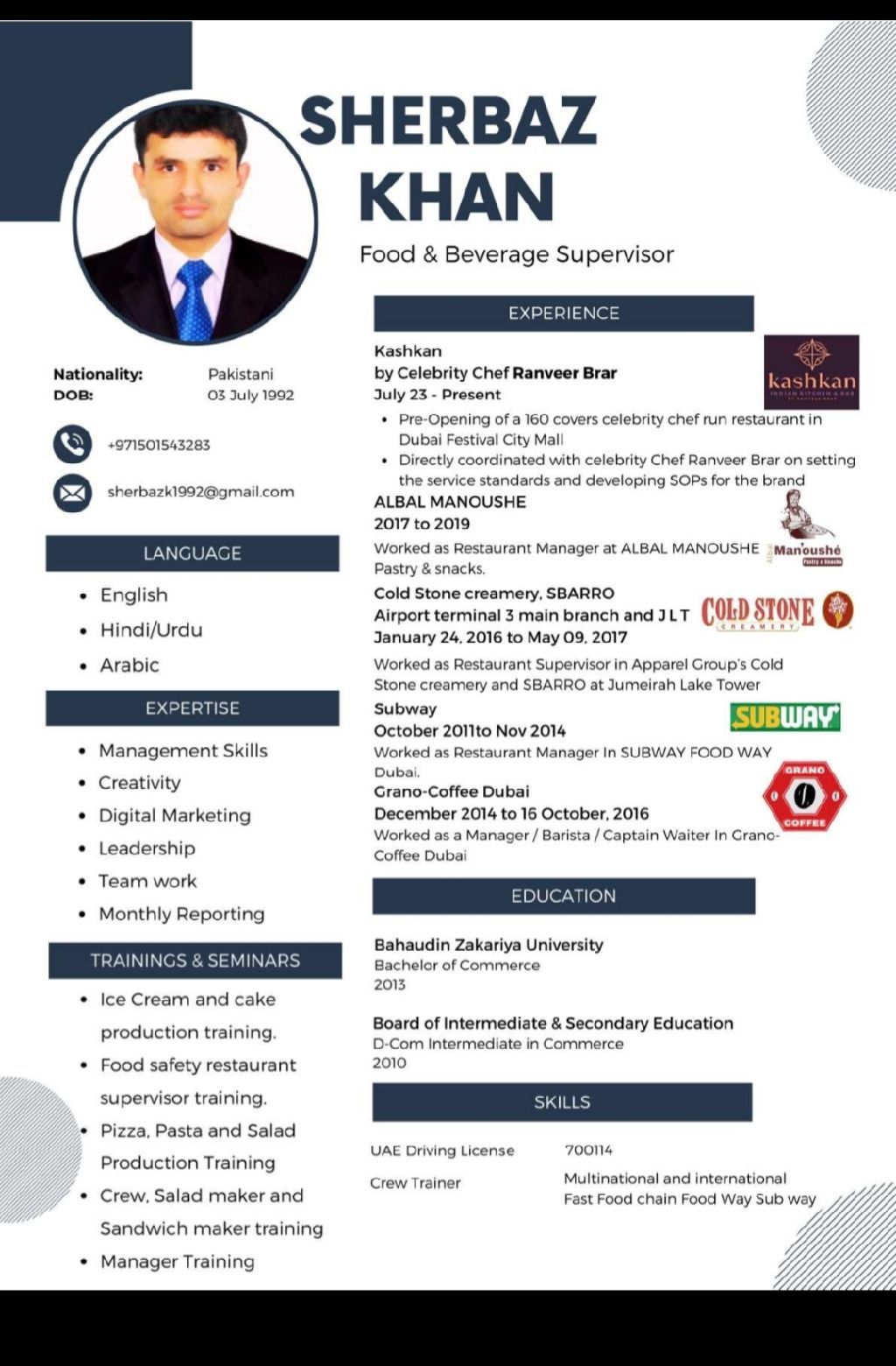 SUBWAY FOODWAY, Cold Stone Creamery, Grano Coffee, Al Bal Manoushe, Kashkanbyranveerbrar Restaurant Manager, Restaurant Supervisor looking for a job