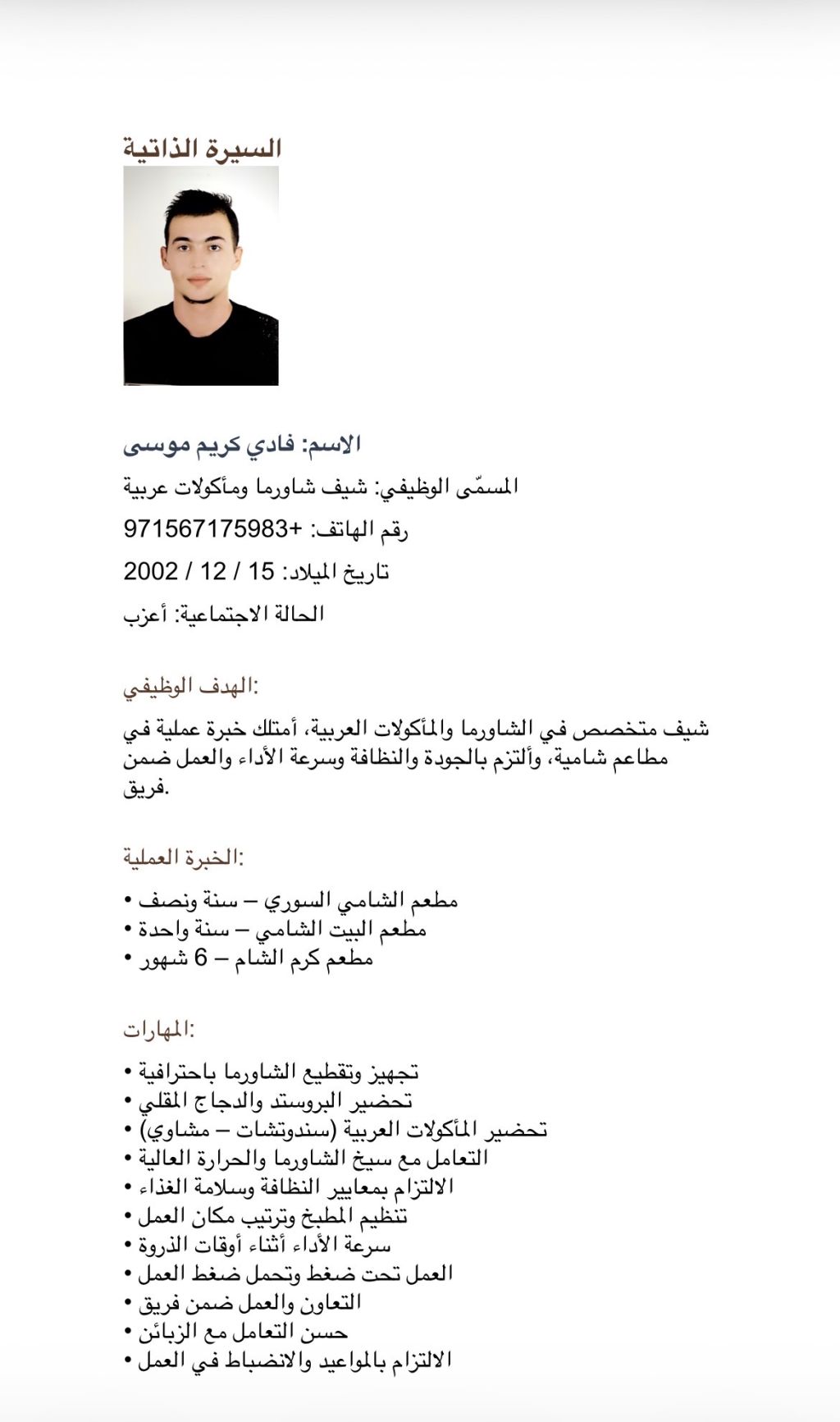 لدي خبرة في العمل داخل مطاعم الشاورما، وأجيد تحضير السندويشات وتجهيز الطلبات بسرعة ودقة مع الالتزام بالنظافة ومعايير السلامة الغذائية. أتعامل باحترام مع الزبائن، وأتحمل ضغط العمل في أوقات الذروة، واعمل بروح الفريق لضمان تقديم خدمة سريعة وجودة عالية ترضي العميل