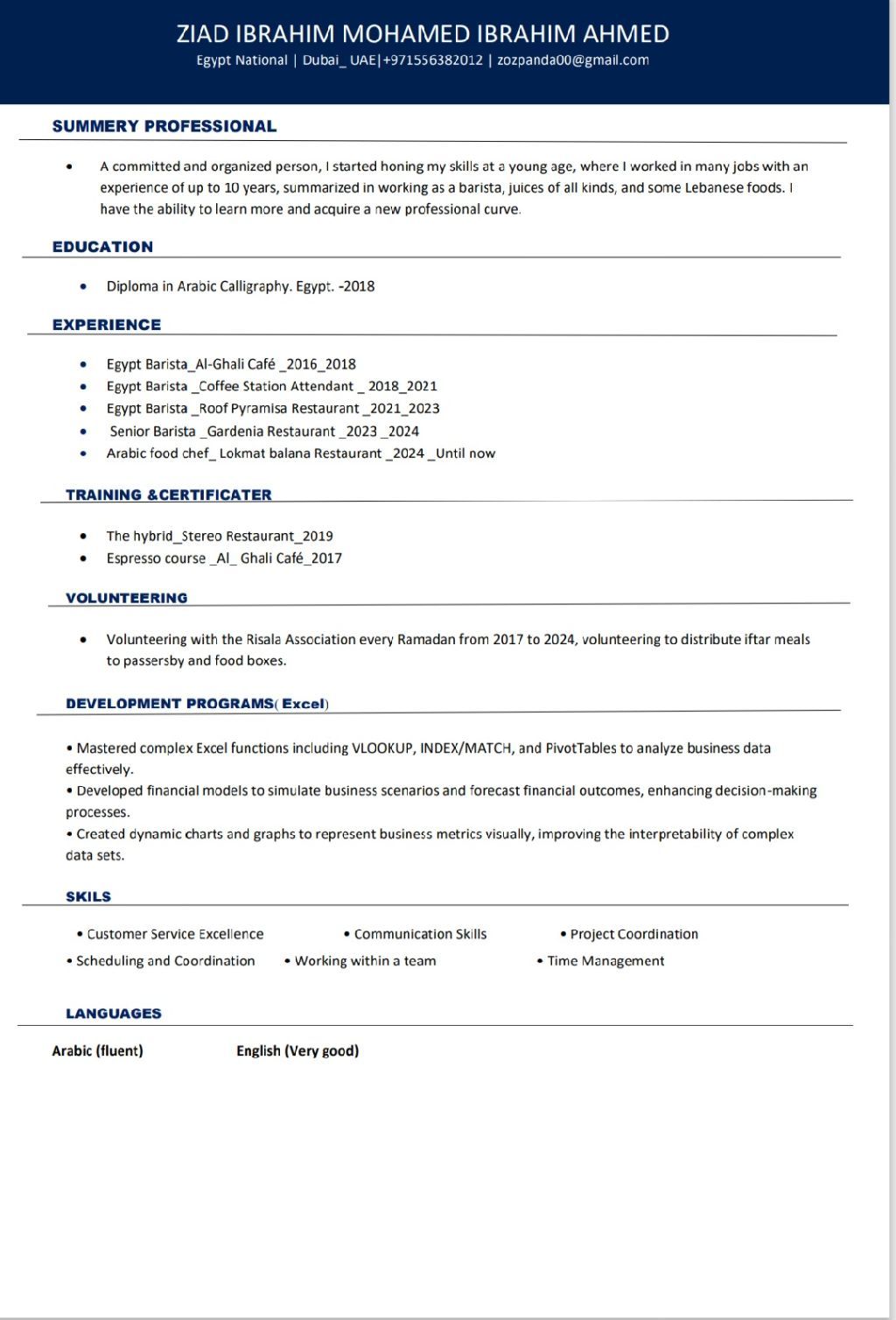 I am looking for a barista position. My name is Ziad Ibrahim, and I am from Egypt. I have 9 years of experience, 8 of which were in Egypt and 1 year here in Dubai. I can prepare and serve all bar items, including juices, milkshakes, hot and cold coffee, all kinds of cocktails, sodas, waffles, and pancakes. I would be delighted to work for you and gain valuable experience