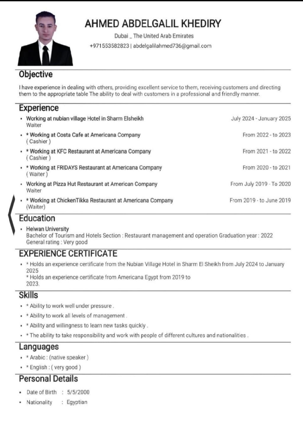 ابحث عن فرصة عمل وايتر أو كاشير وأنا خريج بكالوريوس سياحة وفنادق قسم ادارة وتشغيل مطاعم وعندي خبرة ممتازة في مجال السر فيز وادارة الضيافة. معيا إقامة. خبرة داخل الدولة سنة ونصف