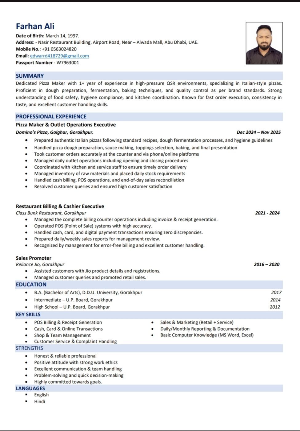 Seeking Work in Tourist and Restaurants in Emirates