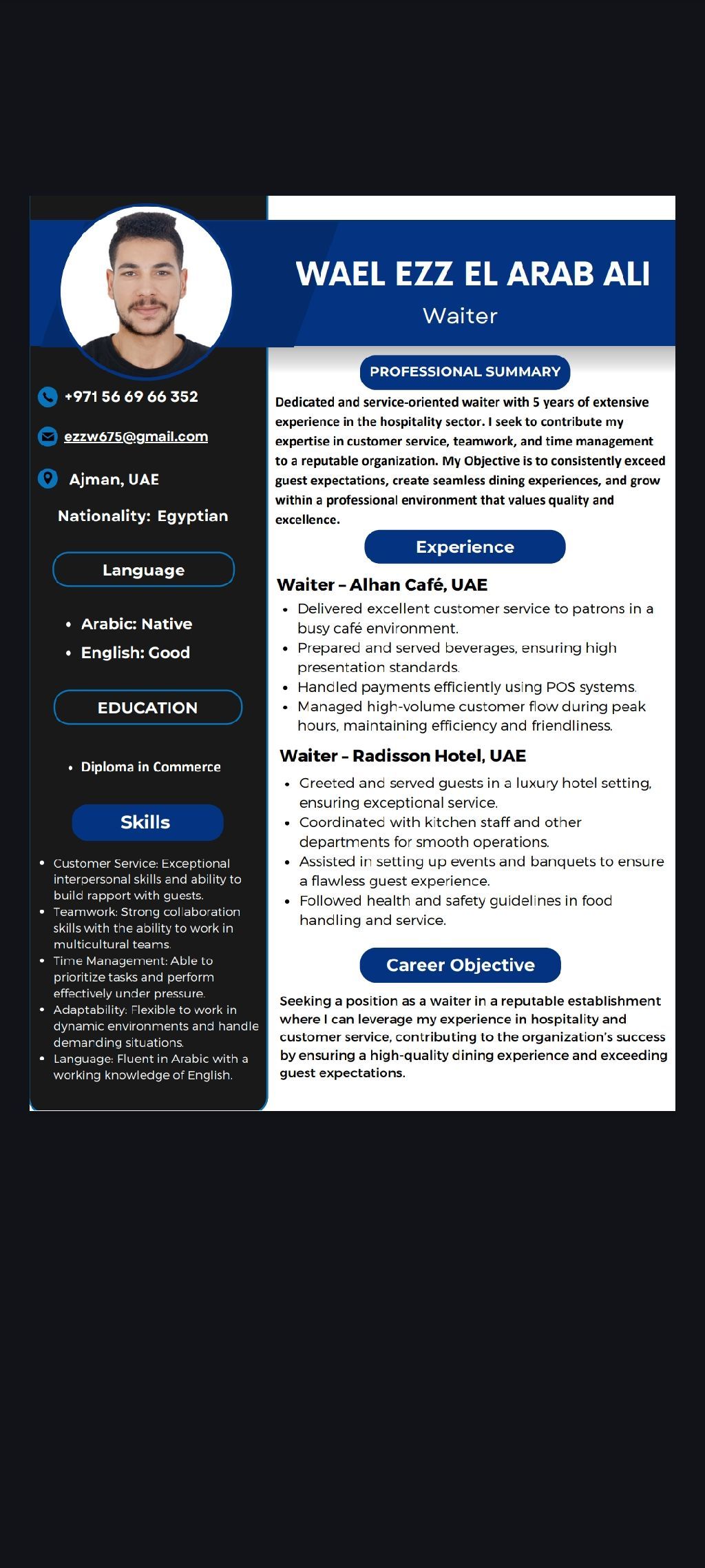 I am looking for a job opportunity. I have six years of experience in the hotel and café industry as a shisha chef. I have a transferable residency permit. Please contact me via WhatsApp or Gmail