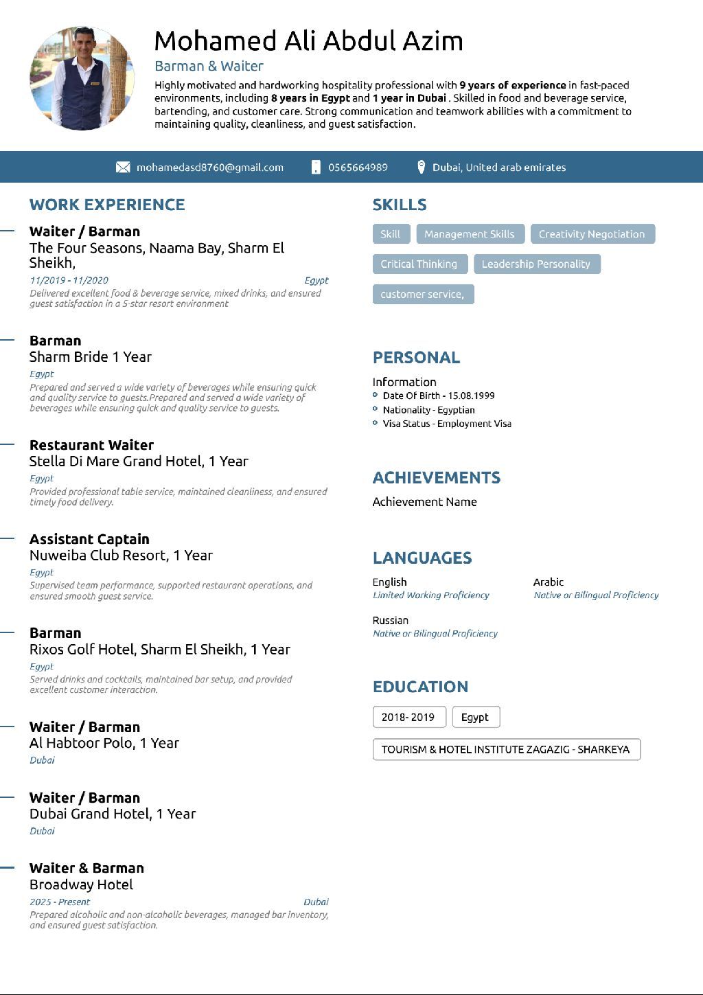 I am looking for a job in the food and beverage industry, specifically in restaurants and hotels. I have experience as a waiter, bartender, and barista. I also have good experience in making cocktails and serving virgin alcohol. I currently reside in Dubai Marina and have a two - year visa