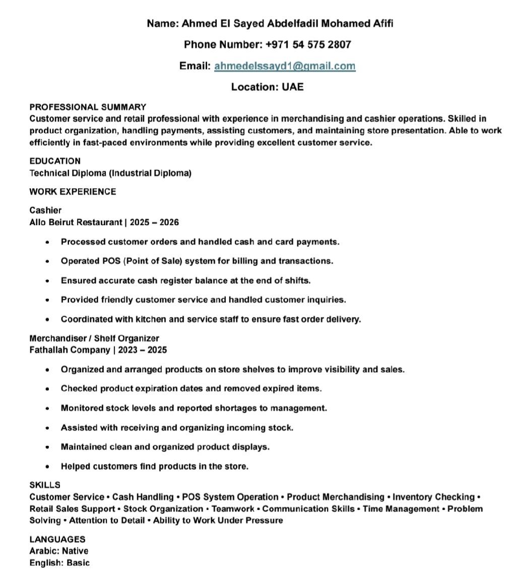 Seeking employment in the restaurant and supermarket sector I have a residence permit