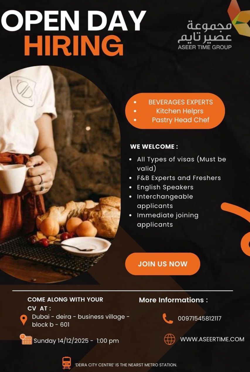 يوم التوظيف المفتوح - مجموعة عصير تايم جروب تعلن مجموعة عصير تايم جروب عن إقامة يوم توظيف مفتوح لاستقطاب الكفاءات المميزة للانضمام الى فريقنا. الوظائف المتاحة خبراء مشروبات مساعدو مطبخ رئيس قسم حلويات التاريخ الأحد الموافق 14 (الأسبوع القادم) المكان دبي - ديرة - مجمع الأعمال (Business Village) المبنى Block B للتقديم يرجى الحضور مباشرة في يوم التوظيف المفتوح