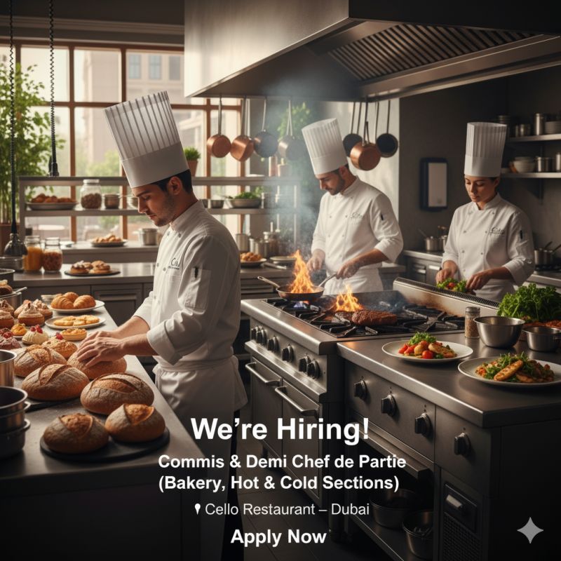 We are Cello restaurant in Dubai Sheikh Zayed Road looking for chefs to join our kitchen team in Cold and Hot sections salary is 3000 + Visa + Food + Accommodation + Health Insurance send your CV to attached