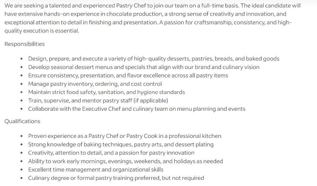 We are seeking a talented and experienced Pastry Chef/ Pastry Chef Assistant to join our team on a full time basis. The ideal candidate will have extensive hands - on experience in chocolate production, a strong sense of creativity and innovation, and exceptional attention to detail in finishing and presentation. A passion for craftsmanship, consistency, and high - quality execution is essential. Dubai