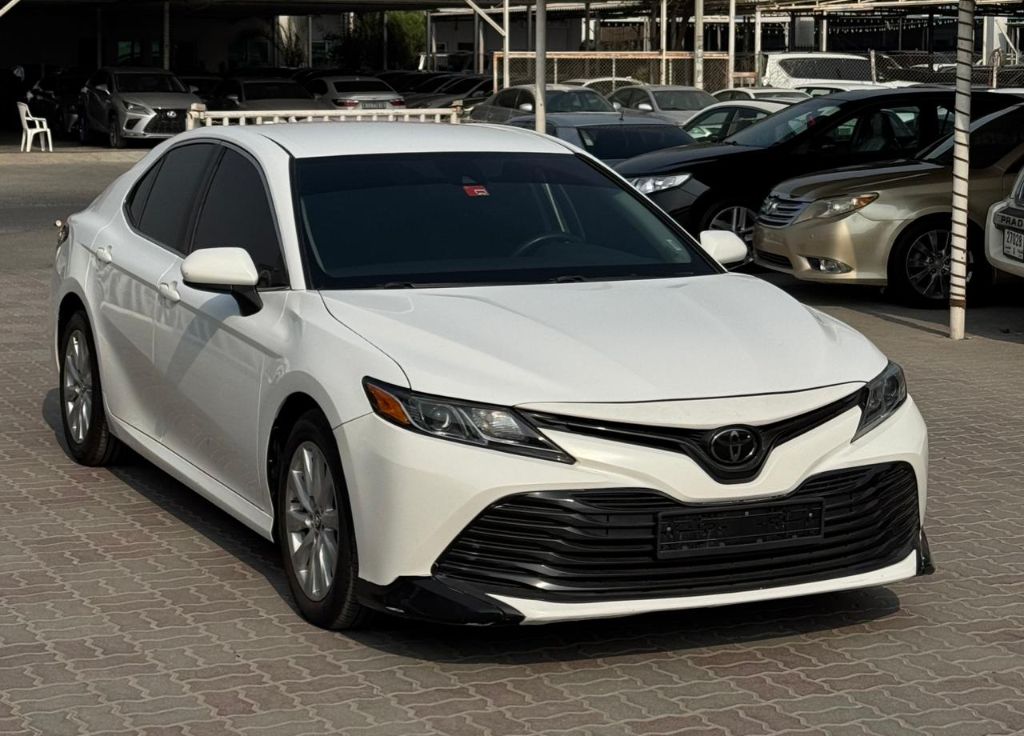 Toyota Camry LE imported from America, model 2019, mileage 208,000 km, first owner in the country, excellent condition, ready for use. Features include screens, rear camera, sensors, electric driver seat, anti-lock brakes, cruise control, and steering wheel controls. Chassis number: 4T1B11HK0KU232140. Price: 38,000 AED negotiable after inspection. Location: Ajman.