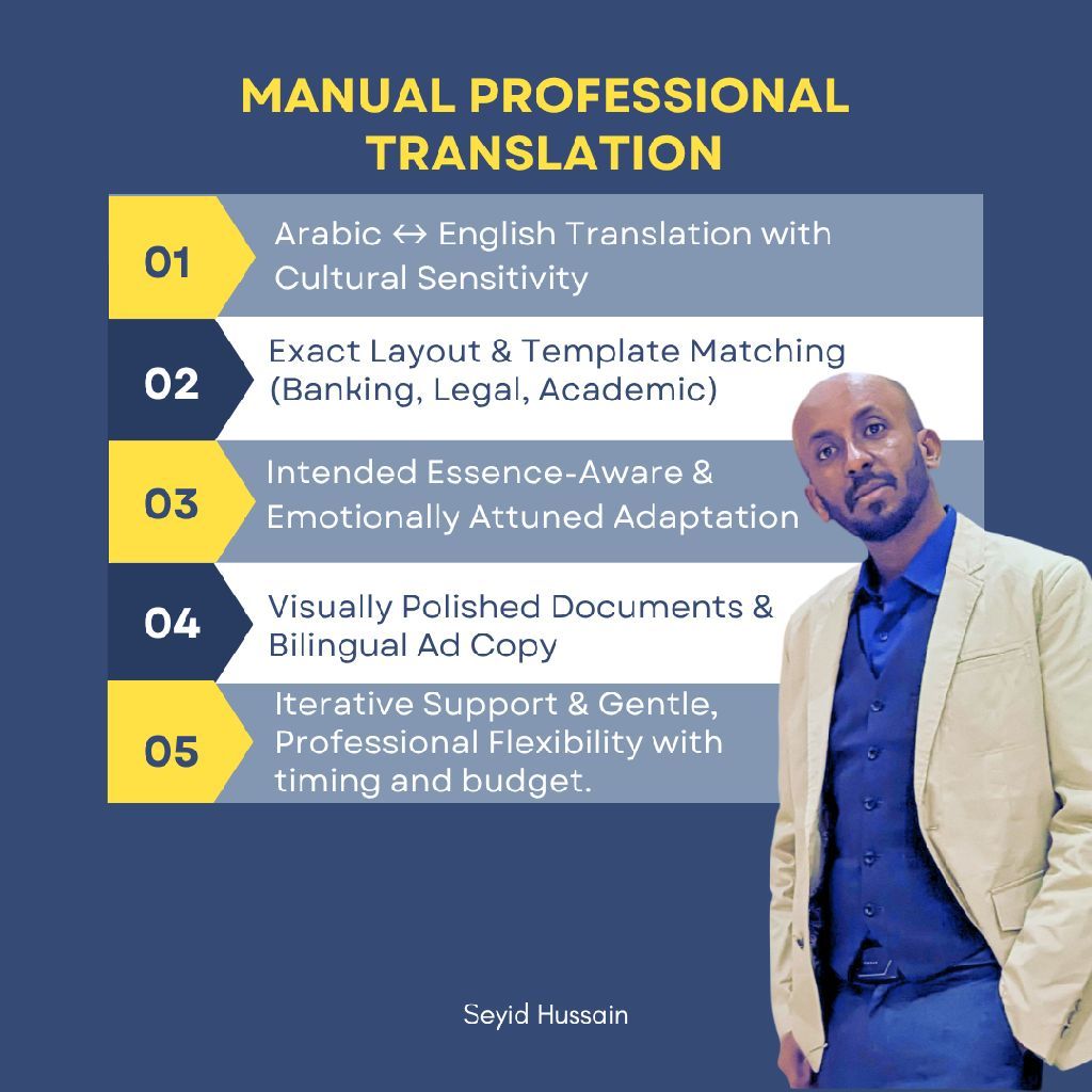 بخبرة تتجاوز 15 عاما في الترجمة بين العربية والانجليزية، أقدم خدمات ترجمة شاملة وتدقيقا لغويا دقيقا ومتقنا. أغطي مجالات القانون، الطب، التعليم، النصوص الدينية، التوطين، كتابة المحتوى، الوثائق التقنية، الى جانب المخطوطات والروايات. موثوق من بعثات الأمم المتحدة وعملاء في دول الخليج. عملي يقرب بين الثقافات، ويجسد المعنى بوضوح وجمال، مع مراعاة دقيقة للخصوصية الثقافية