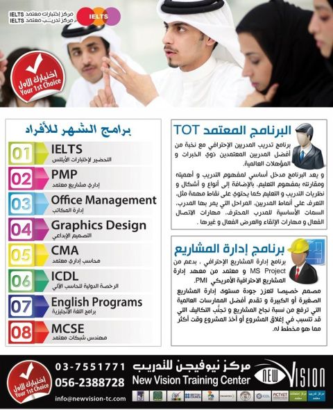 فرصة حلوة جدا لكل اللي عايز يطور نفسه نيو فيجن للتدريب معتمد من أكثر من 20 سنة بيقدم كورسات قوية الفرصة الذهبية للمدرسين والطلاب طور لغتك الانجليزية + تأهل لاختبار الأيلتس IELTS مع مركز نيوفيجن للتدريب المعتمد أفضل المدربين داخل الامارة (عرب وأجانب) أفضل نتائج في الآيلتس داخل الامارة اختبار تحديد مستوى مجاني أسعار خاصة وخصومات للمجموعات أب عتلي دلوقتي وأعرف كل التفاصيل