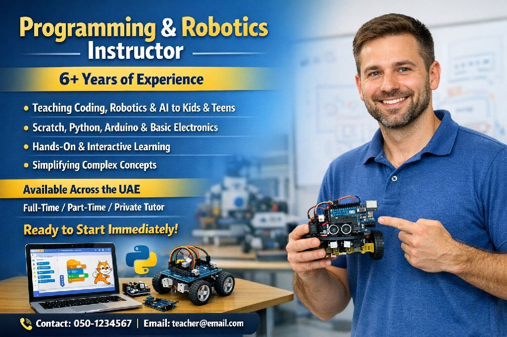 مدرب برمجة وروبوتات بخبرة أكثر من 6 سنوات في تدريب الاطفال والناشئين على البرمجة، الروبوتات، والذكاء الاصطناعي بأساليب تفاعلية وعملية. قدمت دورات في Scratch وPython وأساسيات الالكترونيات وال Arduino. امتلك مهارات قوية في تبسيط المفاهيم وبناء مشاريع تطبيقية. متاح للعمل حضوريا داخل الامارات بدوام كامل أو جزئي، وكذلك كمدرب خاص. جاهز للانضمام فورا