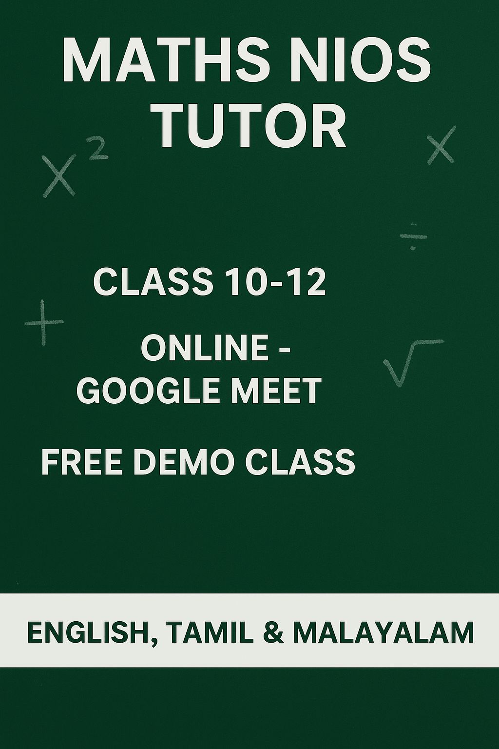 ONLINE Math COACHING - NIOS (Class 10 & 12) Are you looking for a qualified and dedicated NIOS Math Tutor Learn from the comfort of your home with Mrs. Shimna, an experienced teacher specializing in NIOS Board Mathematics for Classes 10 & 12. Key Highlights Individual attention and concept - based learning Online sessions via Google Meet Free Demo Class available Medium of instruction English, Tamil