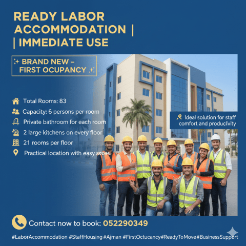 سكن عمال جاهز للاستخدام الفوري فرصة مميزة أول ساكن - جديد بالكامل عدد الغرف 83 غرفة سعة الغرفة حتى 6 أشخاص حمام خاص لكل غرفة عدد المطابخ 2 مطبخ كبير بكل طابق عدد الغرف بالطابق 21 غرفة موقع عملي وسهل الوصول الحل الأمثل لراحة موظفيك وزيادة إنتاجيتهم تواصل الآن للحجز سكن - عمال عجمان سكن - جاهز أول - ساكن