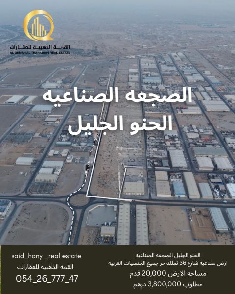 للبيع أرض صناعية الحنو الجليل الصجعة الصناعية تملك حر أجميع الجنسيات مساحة مميزه جدا 20000 قدم شارع 36 العام بسعر 225 درهم للقدم نهائي