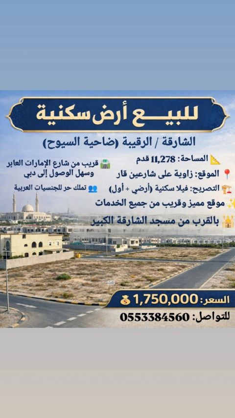 للبيع أرض سكنية - الشارقة / الرقيبة (ضاحية السيوح) المساحة 11278 قدم الموقع زاوية على شارعين قار التصريح فيلا سكنية (أرضي + أول) موقع مميز وقريب من جميع الخدمات بالقرب من مسجد الشارقة الكبير قريب من شارع الامارات العابر وسهل الوصول الى دبي تملك حر للجنسيات العربية السعر المطلوب 1750000 درهم