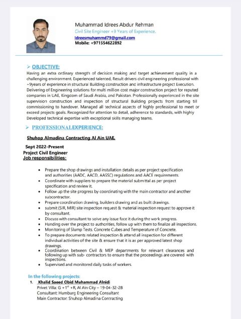 Civil engineer with 9 years of total experience, including 3 years in the UAE. Highly proficient in all phases of project execution, from concrete work to finishing, and skilled in design software. Available to work at a consulting firm. Holds a UAE driving license