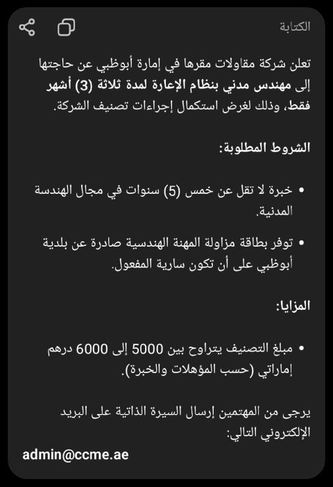 مطلوب مهندس مدني اعارة لغرض التصنيف لشركة مقاولات عامة في مدينة أبو ظبي