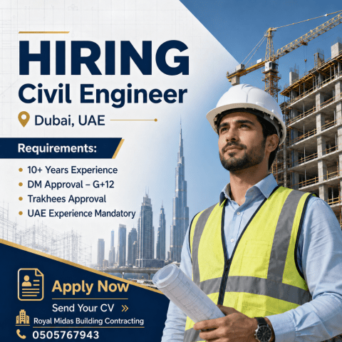 Hiring Civil Engineer Dubai We are looking for a Civil Engineer with strong UAE experience to join our team. Requirements Minimum 10 years of experience in construction/ building projects. Must have Dubai Municipality Approval - G 12. Must have Trakhees Approval. Bachelor’s Degree in Civil Engineering. Good knowledge of site supervision, authority inspections, and consultant coordination. UAE experience