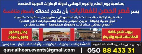 ماجيك لاند للفعاليات جميع الاحتفالات بالعيد الوطني الامالاراتى في دبي وأبوظبي والعين والمنطقة الغربية نعمل من اجل اسعادكم نحن الحل الأمثل لحفلاتكم عند الاتصال بنا حلول وأفكار عصرية وحصرية ويوجد لدينا جميع الخيام الشعبية والفرق الشعبية وكل ما يلزم متخصصون في بناء القرى التراثية والخيام التراثية وبيوت الشعر والعريش والاكلات الشعبية والفرق الشعبية ورسم على الوجه وجميع الشخصيات الكرتونية