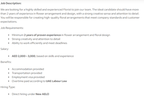 We need florist for flower shop in Ajman