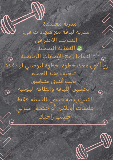 مدربة معتمدة تجمع بين التدريب الذكي والنظام الغذائي المتوازن. أقدم برامج مصممة خصيصا لهدفك سواء شد الجسم، نحت القوام، أو خسارة الوزن. التدريب متاح في الجيم أو في راحة منزلك، بخطط مدروسة تضمن نتائج حقيقية وملحوظة ابدئي رحلتك نحو الجسم المثالي بثقة واصرار، خطوة بخطوة معي
