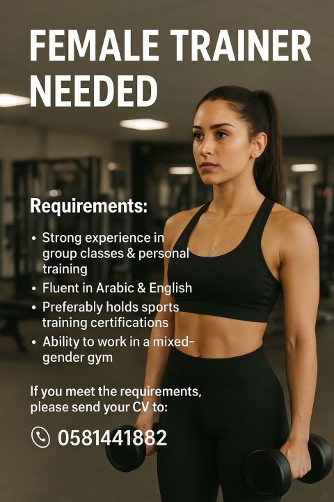 Female trainer needed. Requirements Strong experience in classes and personal training, fluency in Arabic and English, preferably with sports training certifications, Able to work in mixed Gym, Ajman Alnakhel. Those who meet the requirements should send their CV