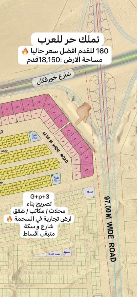 للبيع قطعة أرض تجاريه في منطقة السحمة إمارة الشارقة تملك حر للعرب سعر لقطة أفضل سعر بالسوق تصريح تجاري مكاتب محلات شقق تصريح أرضي + موقف + 3 مساحة الأرض 18 ألف قدم شارع وسكة شارع رئيسي سعر لقطة مطلوب 160 درهم للقدم
