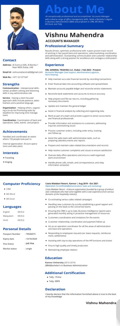 ابحث عن عمل في الحسابات. أنا خريج تجارة. لدي خبرة عملية لمدة 5 سنوات في مجال الحسابات في دولة الامارات العربية المتحدة. أنا جيد في برامج المحاسبة Tally وأعرف البرامج الأخرى بشكل أساسي. أنا أتقن اللغة الانجليزية والهندية والمالايالامية. وأنا أعرف اللغة العربية الأساسية. لدي خبرة جيدة جدا في إجراء الادخالات، واعداد ضريبة القيمة المضافة، والتعامل مع الحسابات الدائنة والحسابات المدينة، واعداد البيانات