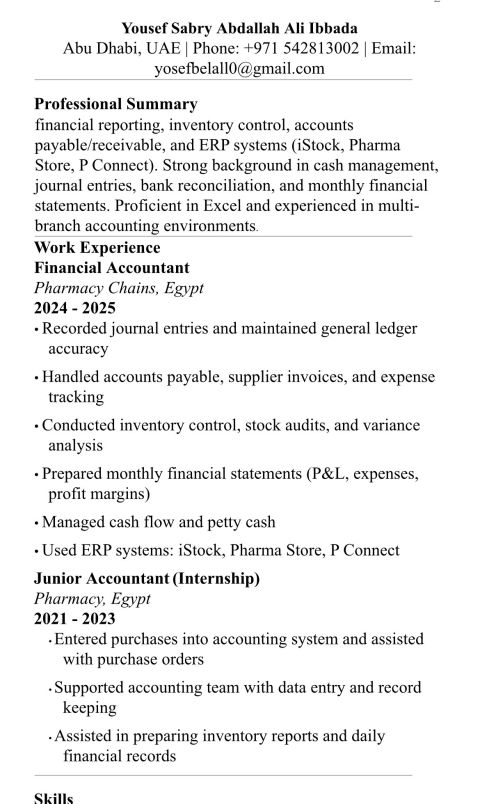 مصري زيارة محاسب مالي بخبرة أكثر من 5 سنوات في قطاع السلع الاستهلاكية (FMCG) متخصص في الحسابات العامة، الحسابات المدينة والدائنة، المحاسبة المخزنية، والتقارير المالية، مع معرفة جيدة بأنظمة ERP
