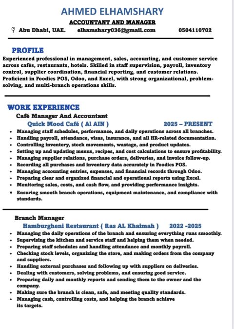 Ahmed Ezzat 29 years Egyptian looking for job Experienced professional in café and restaurant management, sales, accounting, and inventory management. Skilled in Foodics POS, Odoo, Excel reporting, customer service, payroll, and multi - branch operations. Strong ability to manage staff, optimize costs, and ensure smooth operations in hospitality and retail sectors
