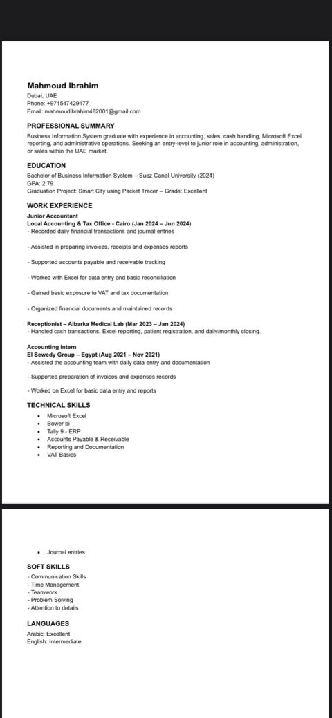 I am an Accountant with 6 years of professional experience in accounting and finance. I have strong knowledge of Bookkeeping and journal entries Financial reports UAE Value Added Tax (VAT) Accounting software Microsoft Excel (reports, reconciliations, spreadsheets) I am detail - oriented, committed, and able to work efficiently under pressure. Available for interviews immediately