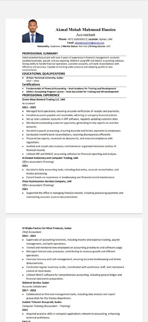 Egyptian visit visa. Financial Accountant with over 5 years of experience in FMCG environments. Specialized in general accounting, accounts receivable and payable, inventory accounting, and financial reporting, with solid knowledge of ERP systems and UAE VAT regulations