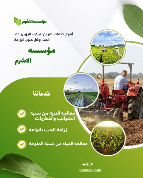 توجد لدينا في مؤسسة الأشرم مجموعة خدمات زراعية متنوعه وبأسعار تنافسية بمناسبة العام الجديد وهي كالتالي تنسيق حدائق وشبكات ري ومعالجه التربة من نسبة الشوائب والفطريات ومعالجه المياه من نسبة الملوحة وزراعة الجت بالمزارع ملحوظة توجد لدينا بذور جت عماني أصلي وسماد عضوي معالج من نسبة الشوائب والفطريات