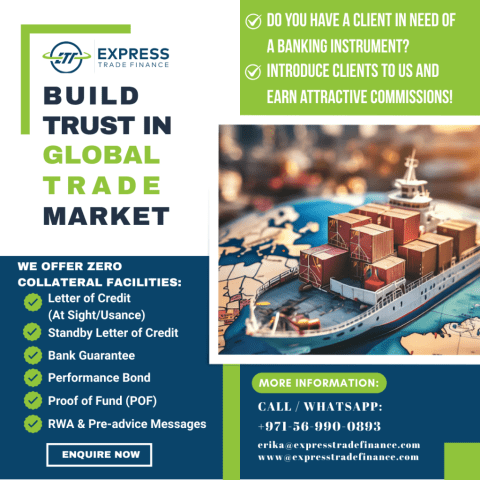 Unlock global trade potential with Express Trade Finance Earn attractive commissions by introducing your clients to our trusted banking instruments. With ZERO collateral facilities like Sight LC, Usance LC, SBLC, Bank Guarantees and more, your clients are in safe hands. Connect with us today for more information. Call Email Website expresstradefinance. com