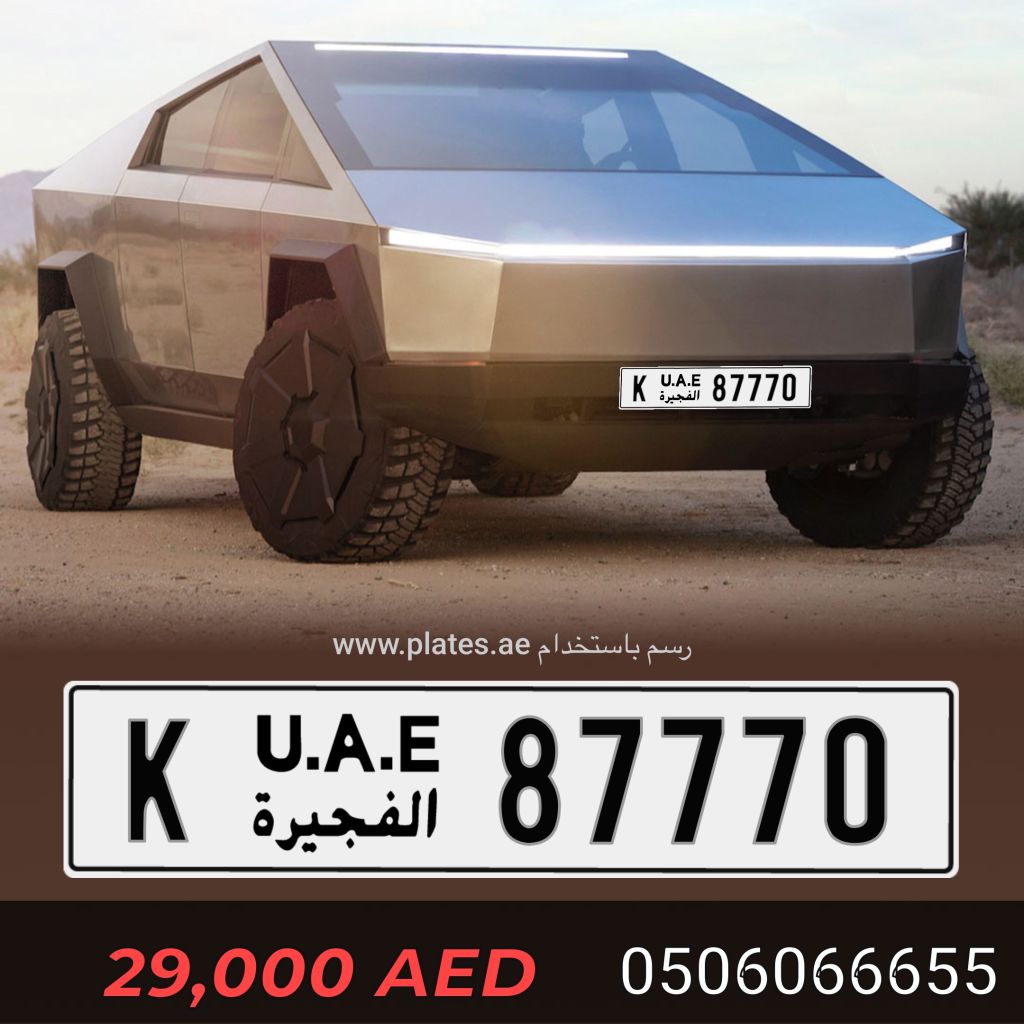 Special car plate code and number ( K 87770) with the new design of plates for the Emirates of Fujairah This number is unused and the offer price is less than the Market. Great opportunity for those who like to be special. Best Regards
