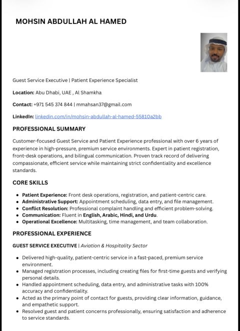 Customer - focused Guest Service/ Patient Experience professional with over 2 years of experience in healthcare or premium hospitality environments. Skilled in patient registration, front - desk operations, complaint resolution, and bilingual communication