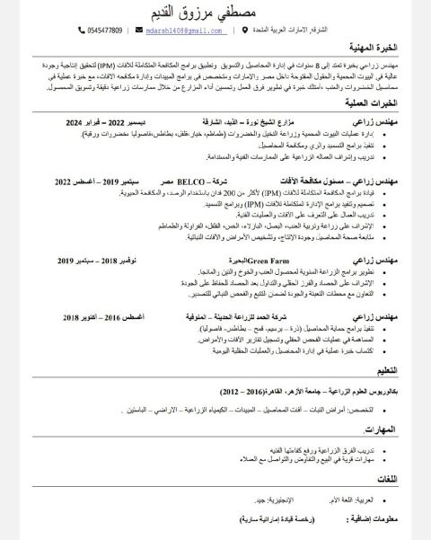 مهندس زراعي خبرة 8 سنوات في إدارة وتشغيل المزارع بأنظمتها المختلفة (البيوت المحمية والحقول المكشوفة) في مصر والامارات. خبرة في إدارة محاصيل الخضر (طماطم وخيار - فلفل وكوسة وورقيات) بالاضافة الى النخيل. أجيد وضع وتنفيذ برامج الري والتسميد والمكافحة المتكاملة للآفات (IPM) وتحسين جودة وإنتاجية المحاصيل. اشراف كامل على العمالة الزراعية وتدريبهم على الممارسات الفنية امتلك رخصة قيادة اماراتية سارية