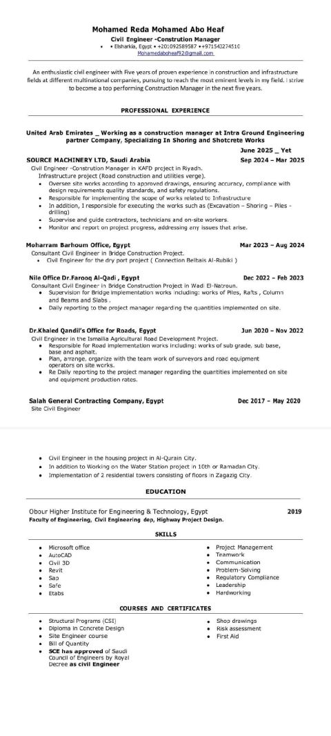 مهندس مدني خبرة 8 سنوات بالموقع. الخبرة في مصر والسعودية والامارات مثل الانشاءات والطرق والكباري والحفر العميق والتشطيبات جاهز للعمل بالموقع